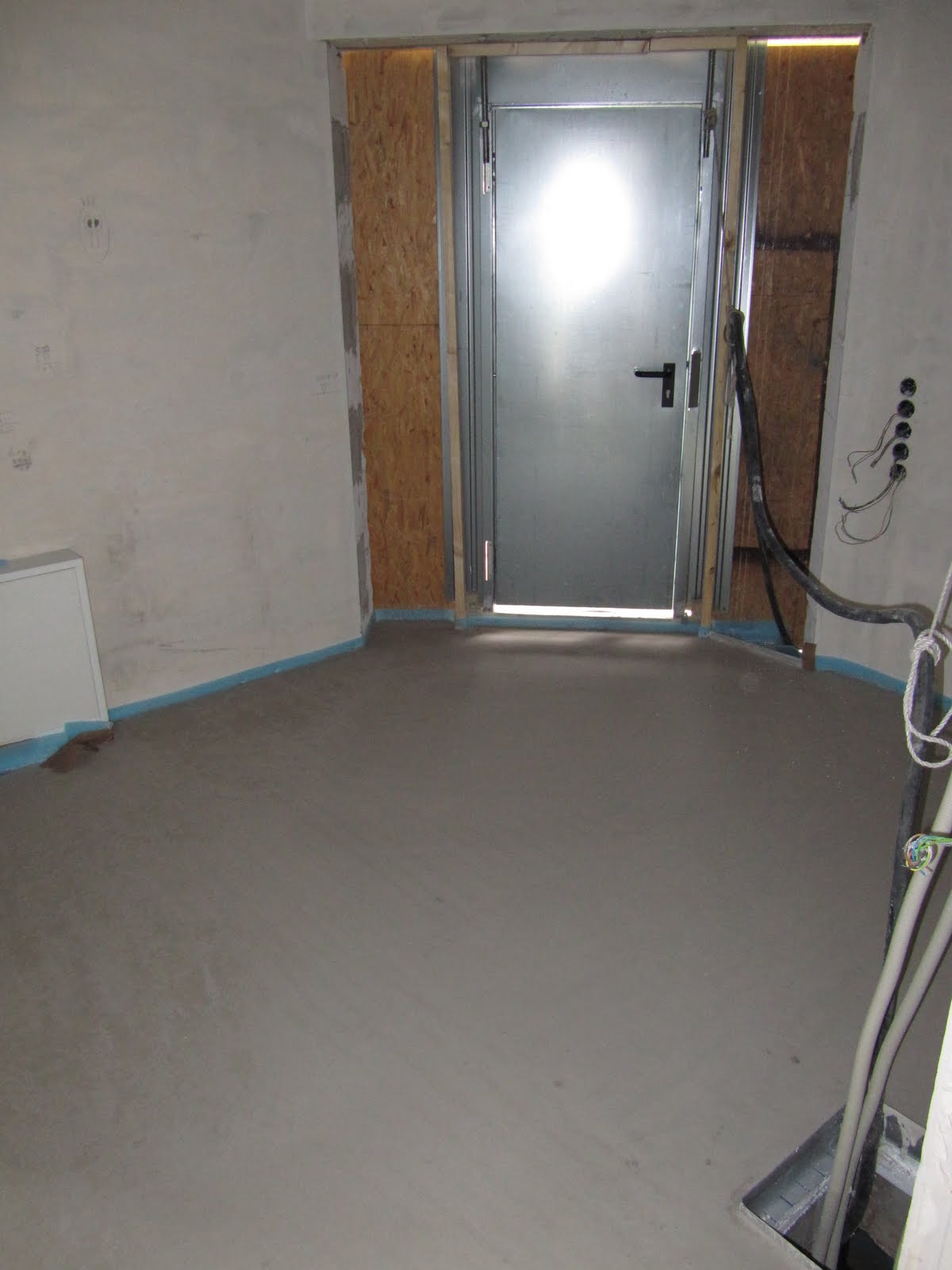 Der Estrich ist nun begehbar und so siehts im Haus jetzt wieder etwas aufgeräumter aus, die Heizschlangen der Fussbodenheizung sind verschwunden und alles ist eben. Also fast, leichte Unterschiede brauchen wir doch für unterschiedliche Bodenbeläge.